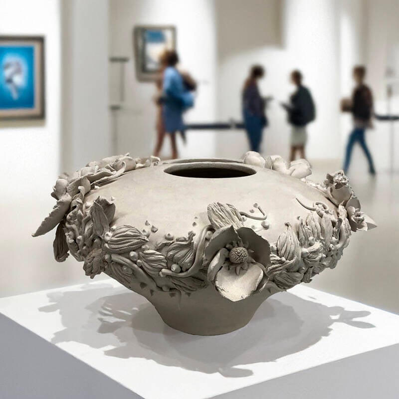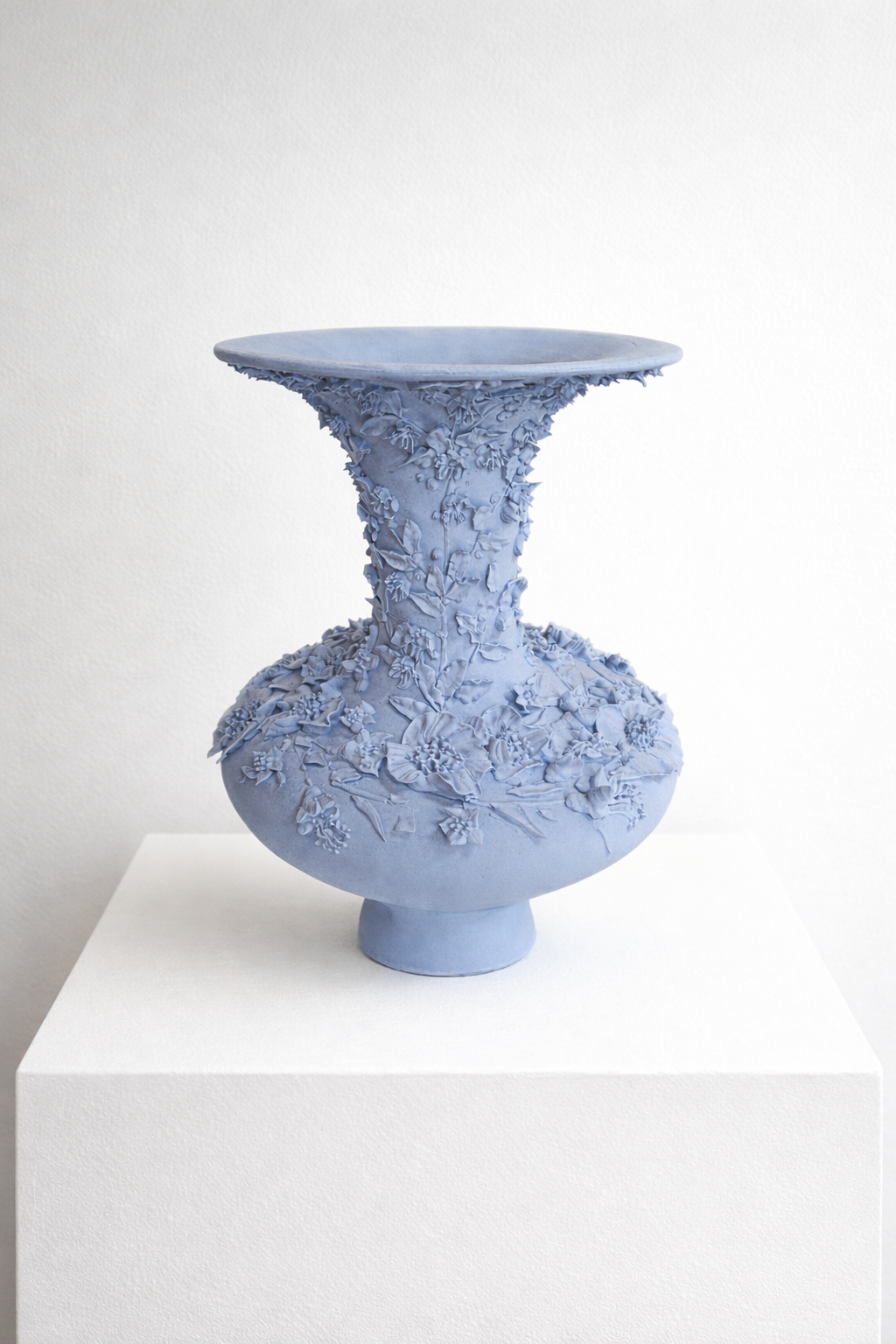 Her background in cake decoration continues to inform the work technically. Techniques of piping, layering and intricate surface building translate naturally into clay, where decorative structures can spread across the vessel like colonies or organic growths.