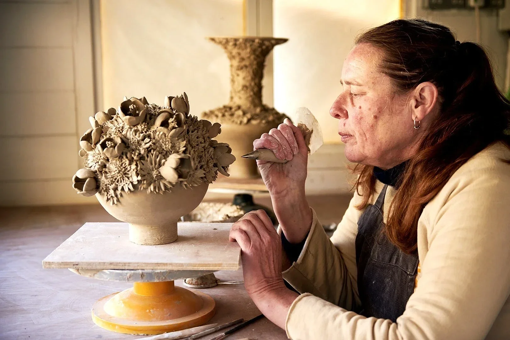 Her return to clay came unexpectedly through time spent in the ceramic studio she shares with her husband. Since establishing a studio together in Hastings, she has been developing a body of sculptural ceramic work that draws on both traditional ceramic processes and the decorative expertise developed throughout her career.